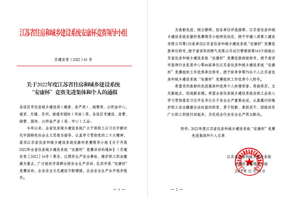 近日,江苏省住房和城乡建设系统安康杯竞赛领导小组发布了《关于2022年度江苏省住房和城乡建设系统“安康杯”竞赛先进集体和个人的通报》,检测中心荣获2022年度江苏省住房和城乡建设系统“安康杯”竞赛先进集体。