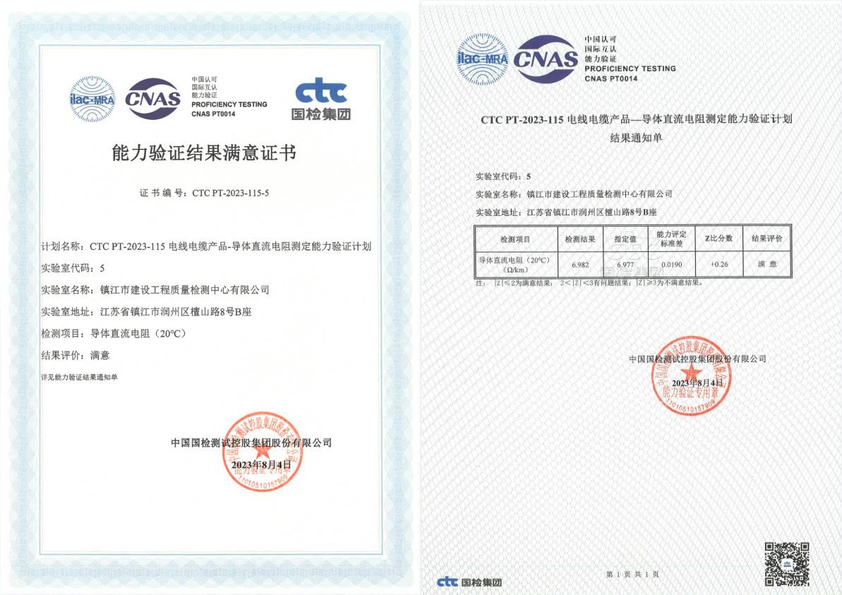 PT-2023-115电线电缆产品——导体直流电阻测定能力验证计划”。近日,检测项目提交的结果评价为“满意”(Z比分数:0.26),顺利通过此次能力验证。