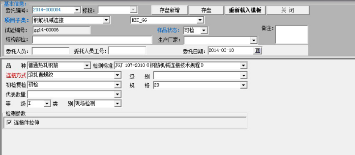委托编号自动生成,不需要做处理,进入这个界面会默认带入一个工程的信息,如果不是所需要的工程,可以在“工程名称”的下拉里选择所需要的工程名称或者手工输入。如果有分项工程,请填入,没有就空着,确认信息无误后,点“存盘退出”,这样一个委托单就生成了,可以在图5的界面上看到新建的委托编号,委托编号新建完成后,点击“新建样品单“按钮,新建样品单,进入图7。